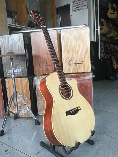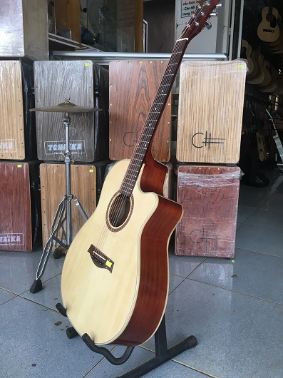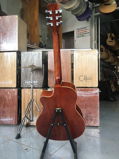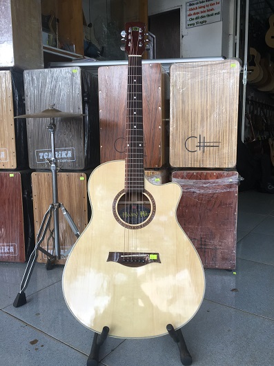 Guitar 1.500 – HĐ 15 Mặt gỗ thông nguyên tấm AA (Gỗ già) – Eo lưng gỗ hồng đào – Đàn có ty chỉnh cong cần có bọc viền đàn chỉ trắng – Cần đàn gỗ Mun – Phím Inox – Khóa đúc trắng loại tốt – Dây đàn Alice 432
